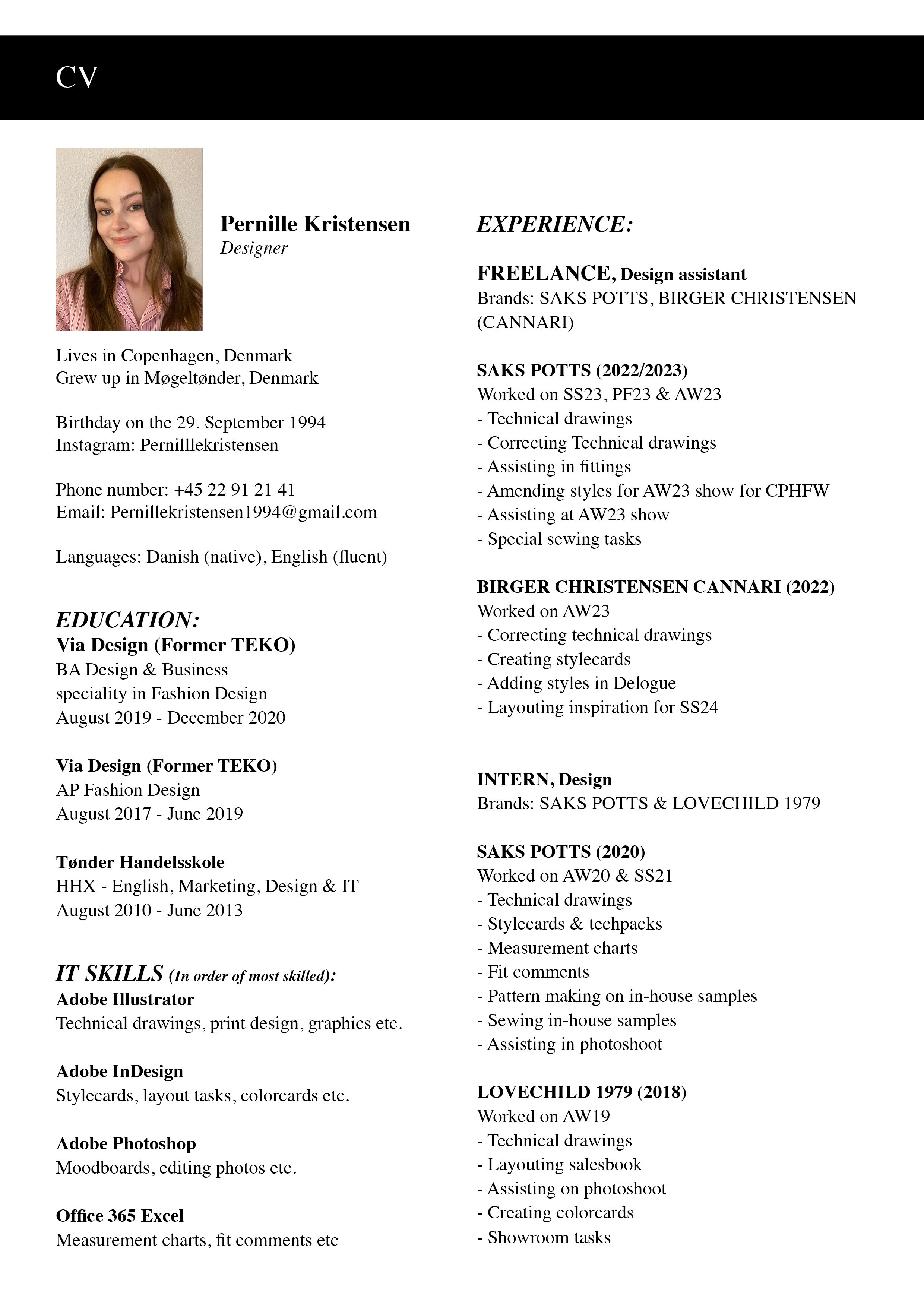 Uddannet fra VIA Design med en PBA i Design og Business med speciale i fashion design. Som designer er min æstetik præget af 90'er/00'er popkultur, men med øje for klassisk konfektionering og tidens tendenser.